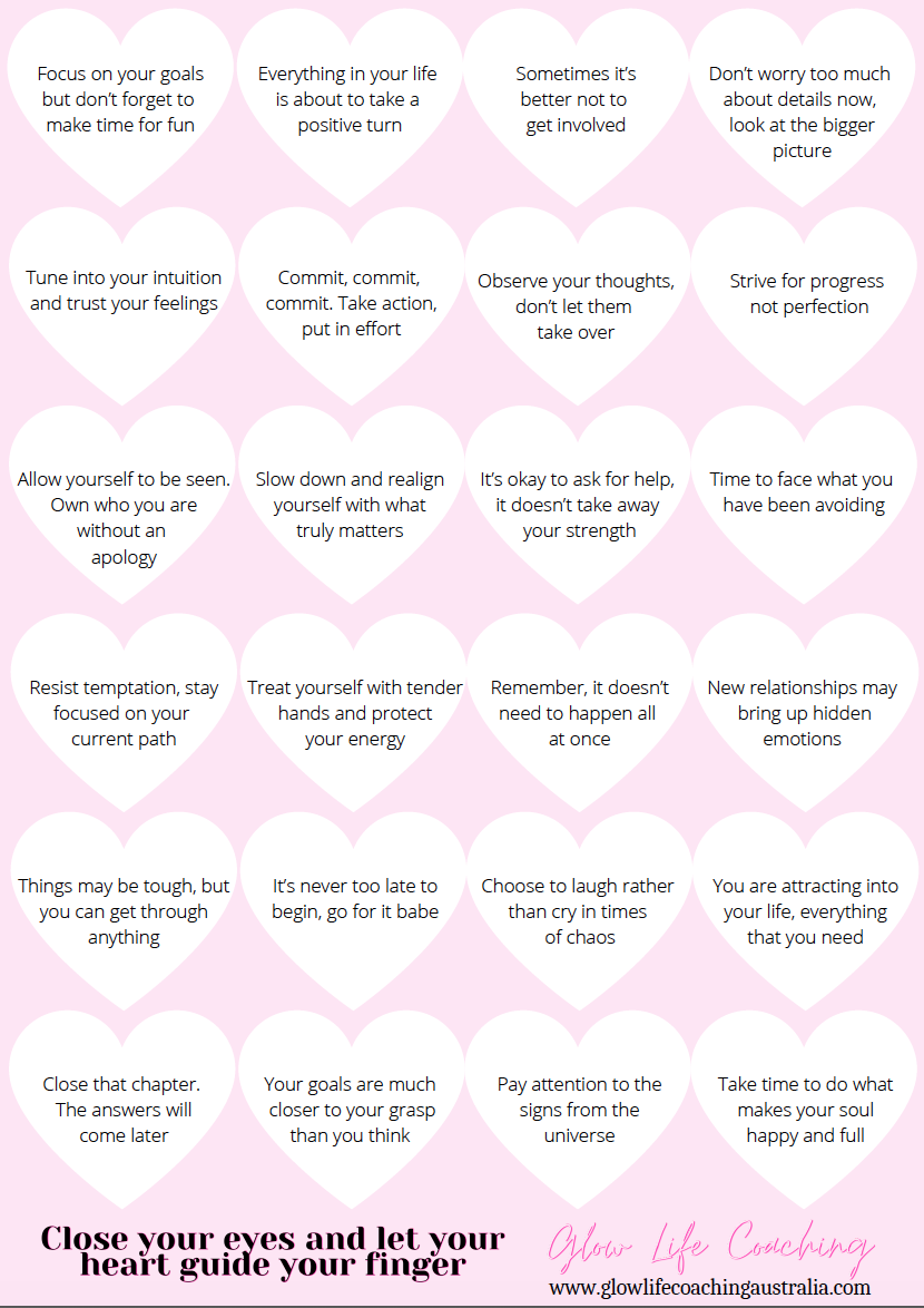 Print this poster out and stick it behind your bedroom door. At the beginning of each week, stand in front of the poster with your eyes closed. Be clear on what you want guidance on and allow your intuition to guide your finger to the heart that contains your divine message for the week!
